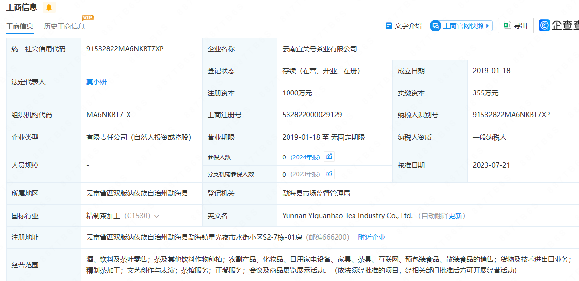 云南宜关号茶业有限公司成立于2019-01-18,法定代表人为莫小妍,电话:18664888468;注册资本为1000万元,企业注册地址位于云南省西双版纳傣族自治州勐海县勐海镇星光夜市水街小区S2-7栋-01房,经营范围包含:酒、饮料及茶叶零售;茶及其他饮料作物种植;农副产品、化妆品、日用家电设备、家具、茶具、互联网、预包装食品、散装食品的销售;货物及技术进出口业务;精制茶加工;文艺创作与表演;茶馆服务;正餐服务;会议及商品展览展示活动。(依法须经批准的项目,经相关部门批准后方可开展经营活动)。企业当前经营状态为存续。